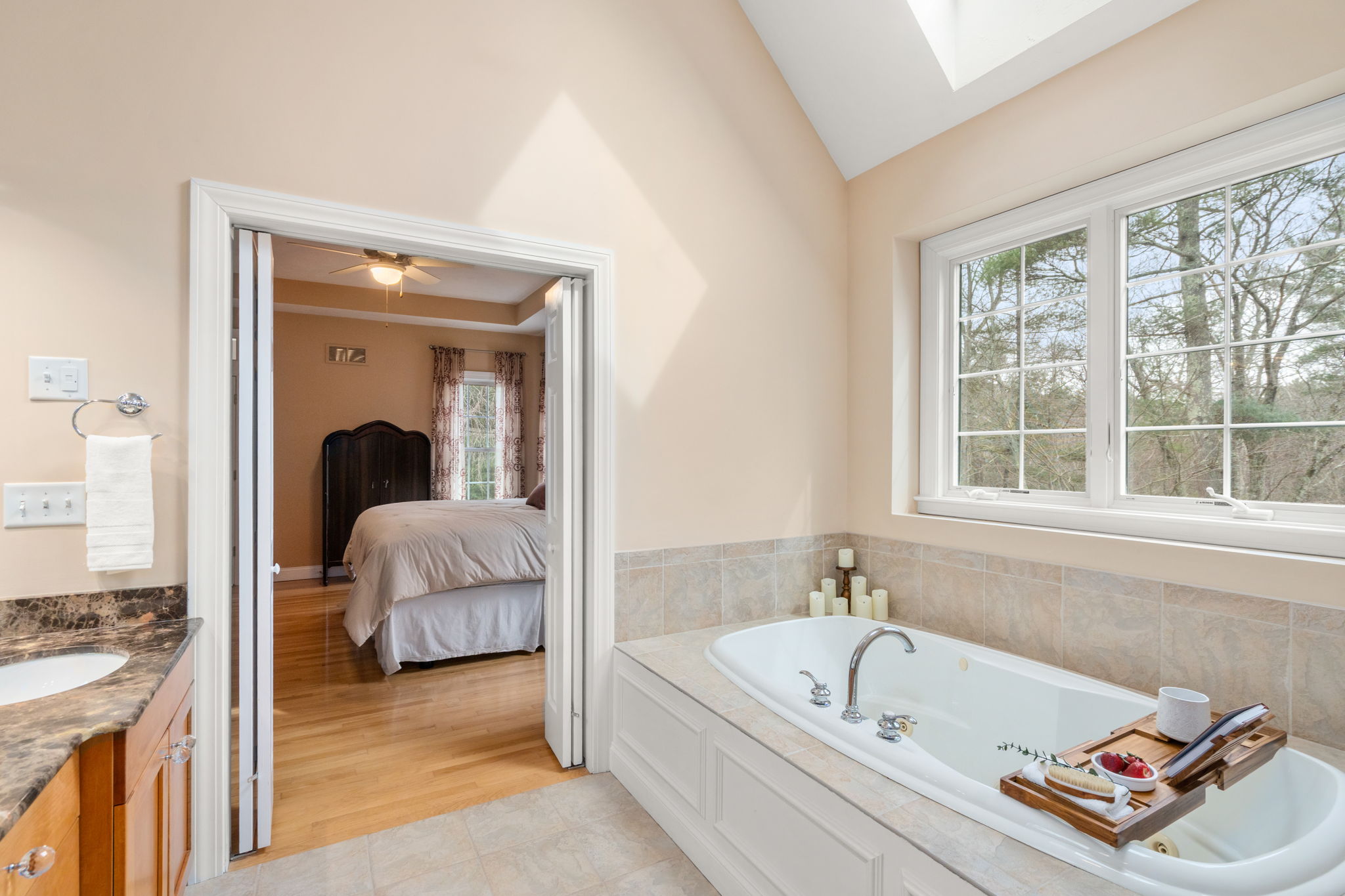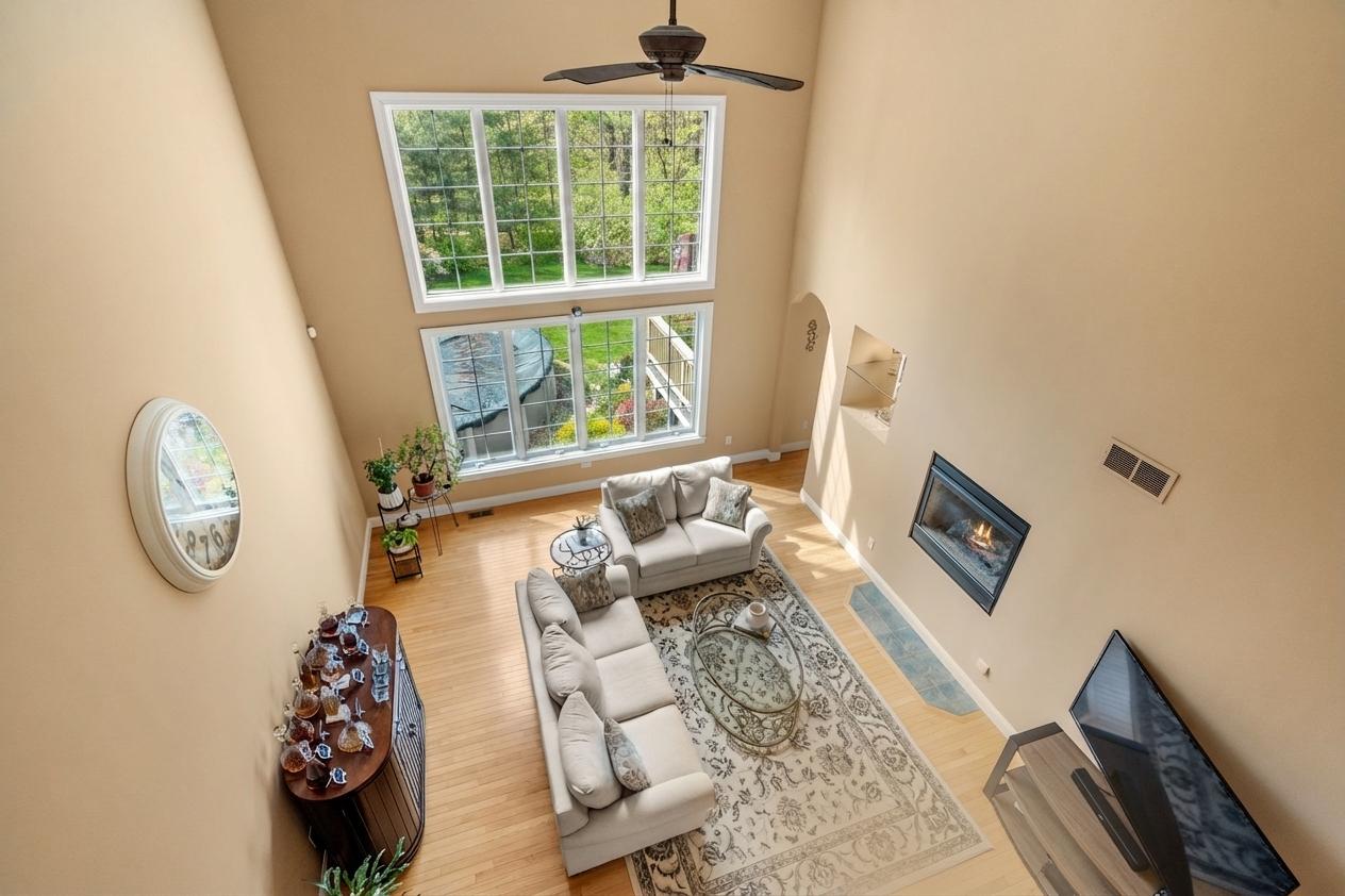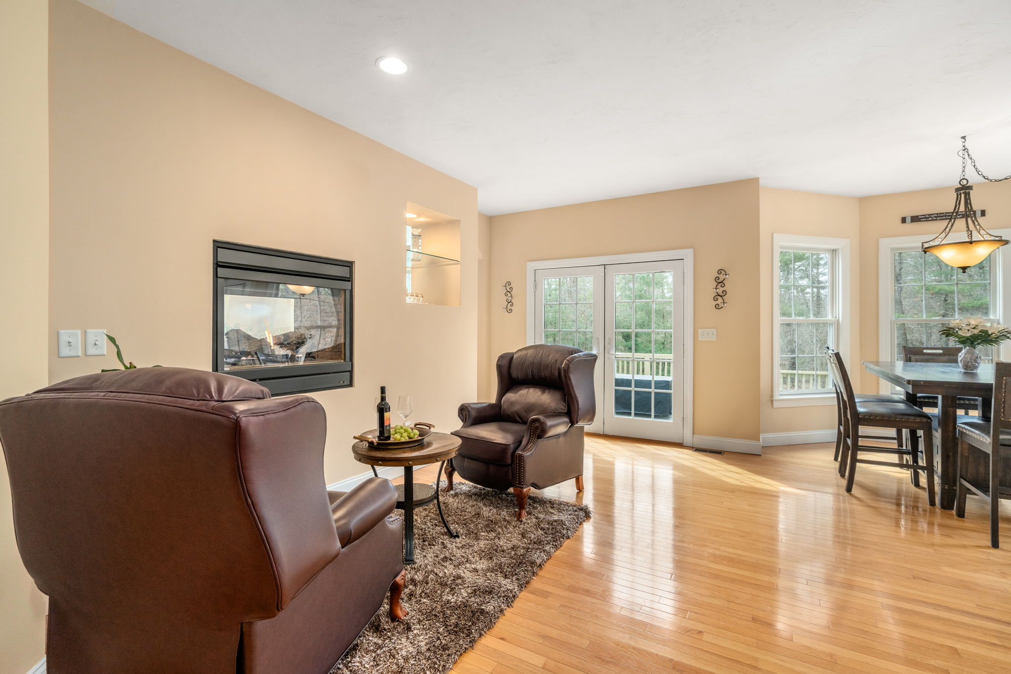 Inside, natural light pours through an open, airy layout with gleaming hardwood floors throughout the first level. A striking two-sided fireplace connects the sun-filled living room, which is anchored by a dramatic wall of windows to the well-appointed kitchen, creating a seamless flow for both relaxed living and entertaining.