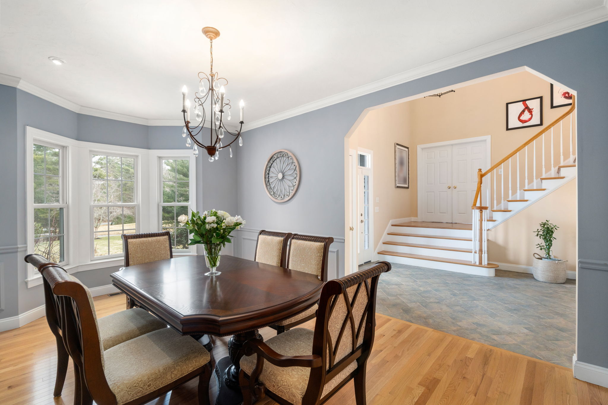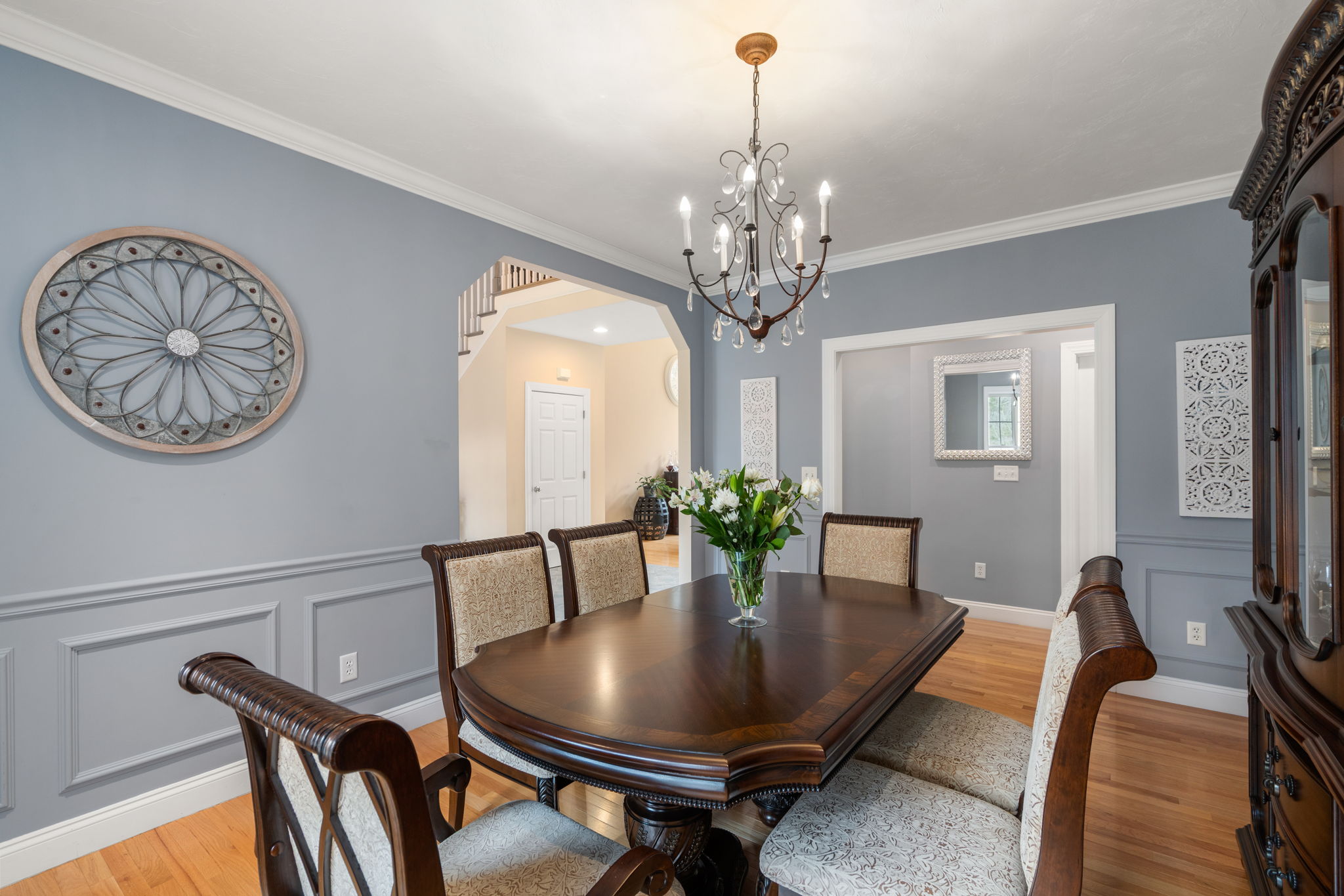 The kitchen offers an expansive island, gas cooktop, stainless appliances, walk-in pantry and a bright breakfast nook. A formal dining room with detailed millwork and bay window adds a refined touch for special gatherings.